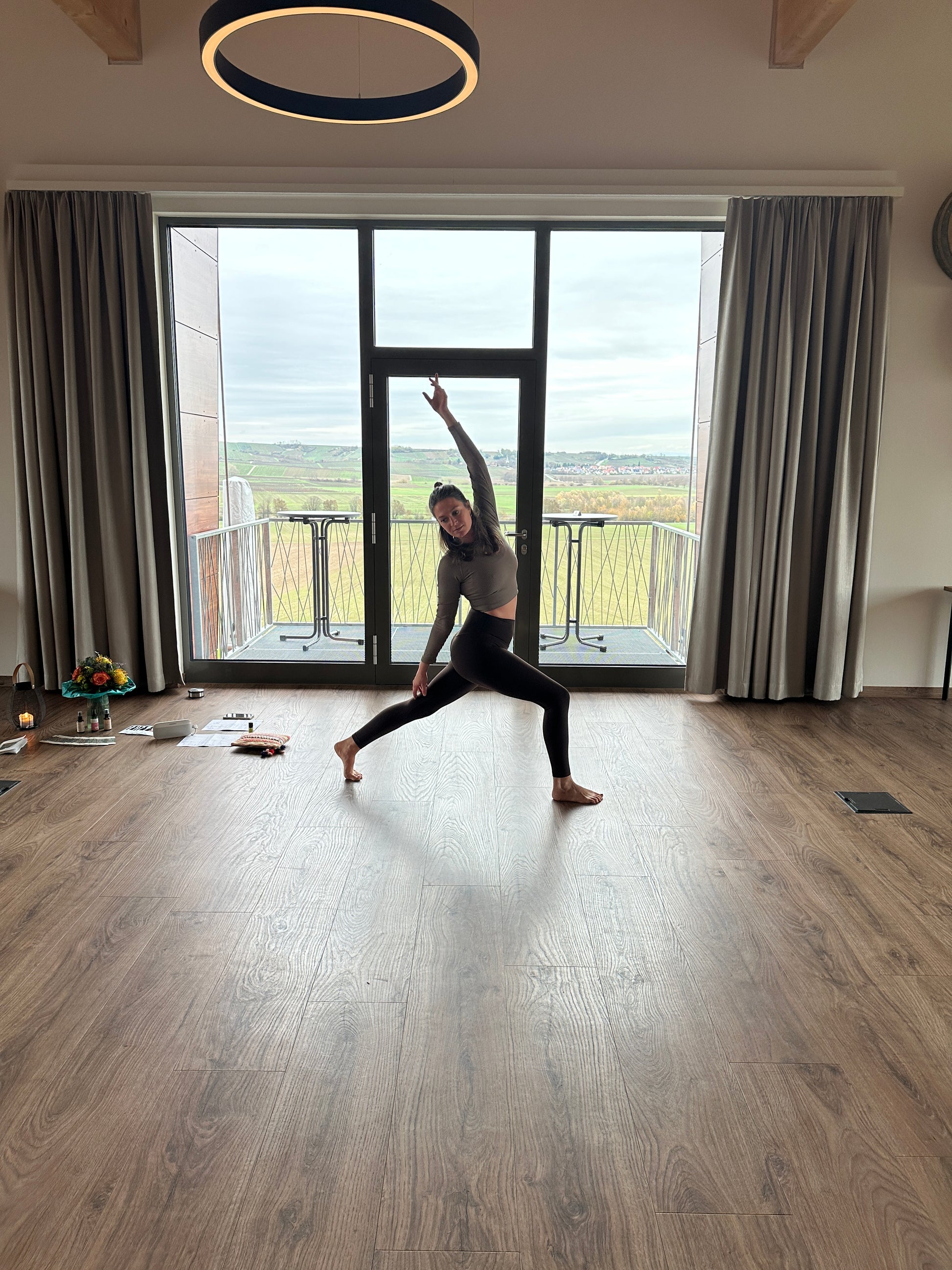Die Yoga Sessions finden in einem wunderschönen großen Raum mit atemberaubenden Blick über die Weinberge statt.
